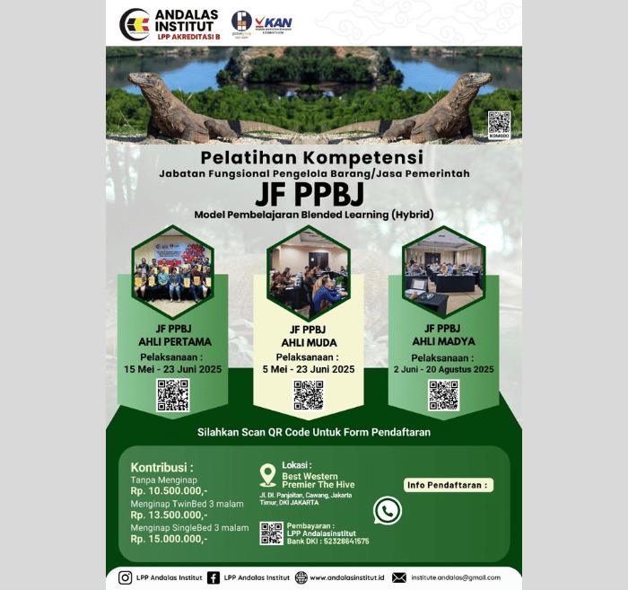 Kami dari LPP Andalas Institut, sebagai Lembaga Terakreditasi LKPP RI, dengan bangga membuka pendaftaran untuk Pelatihan Kompetensi Jabatan Fungsional Pengelola Pengadaan Barang/Jasa (JF PPBJ) jenjang Pertama, Muda, dan Madya.