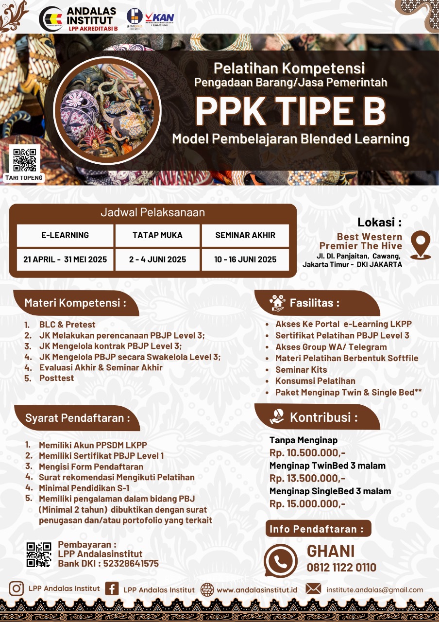 Bergabunglah dalam Pelatihan Kompetensi PBJP PPK Tipe B untuk meningkatkan pemahaman dan keterampilan dalam Pengadaan Barang/Jasa Pemerintah. Program ini dirancang dengan metode Blended Learning, yang menggabungkan pembelajaran daring dan tatap muka.