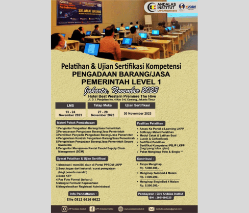 Pelatihan akan diselenggarakan pada 3 – 29 November 2023 dan dilanjutkan dengan Ujian Sertifikasi pada 30 November 2023 yang bertempat di Hotel Best Western The Hive, Cawang, Jakarta Timur. Segera daftarkan diri Anda dan tingkatkan kompetensi di bidang Pengadaan Barang/Jasa Pemerintah.