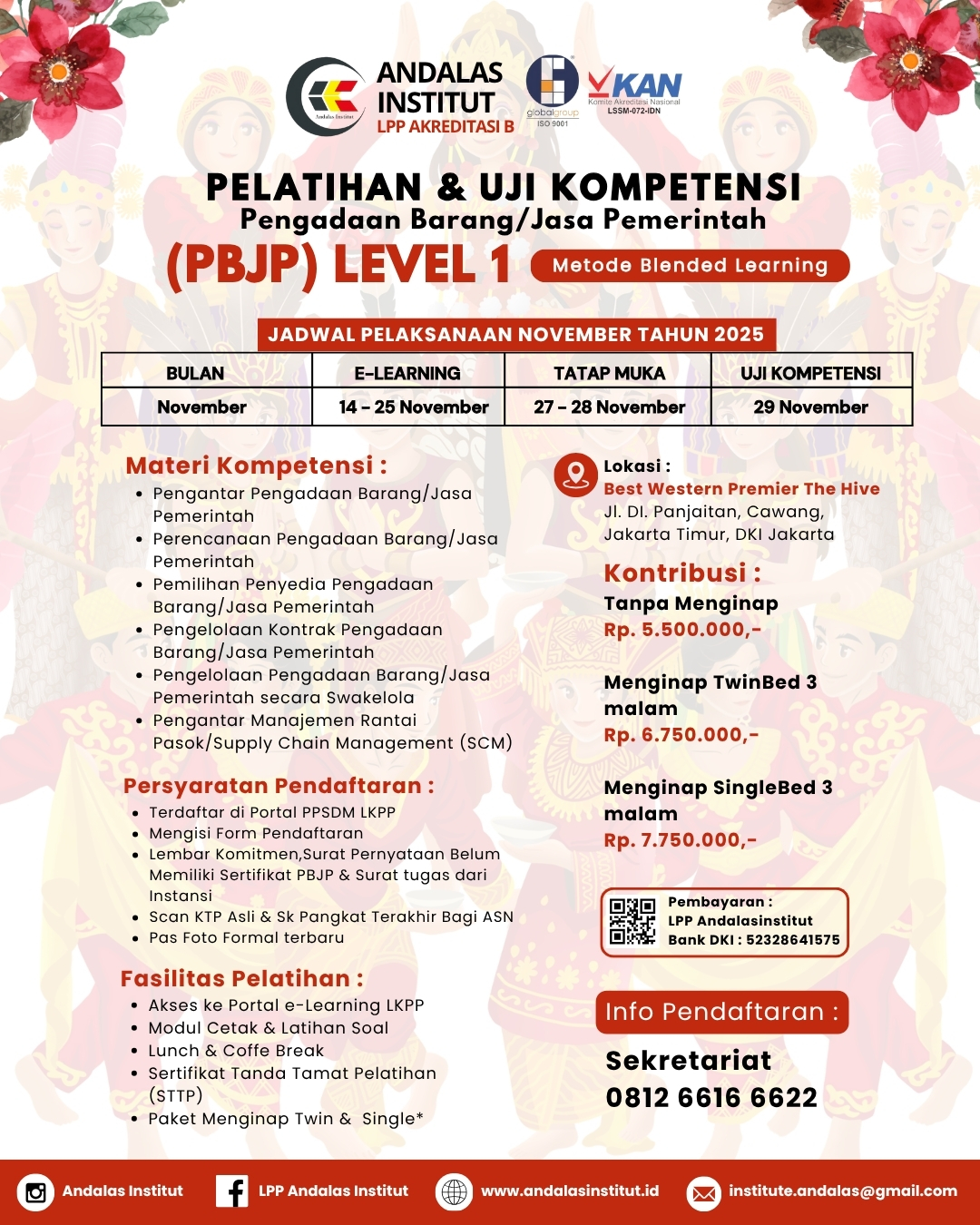 - Sertifikat Uji Kompetensi PBJP Level 1 dari LKPP (Bagi yang Lulus Uji Kompetensi) Paket Menginap Twin & Single*